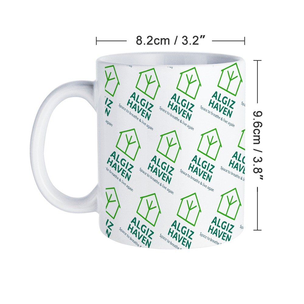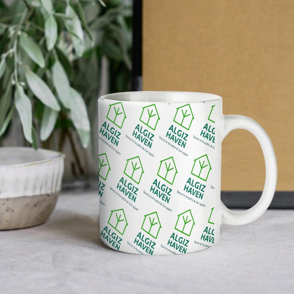 All-Over printed mug with the Algiz Haven logo and tagline, with all profits helping to fund programs and housing for vulnerable people